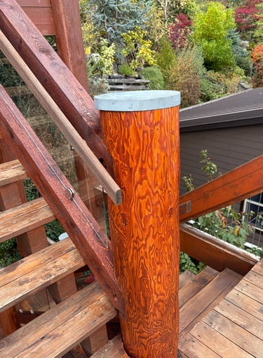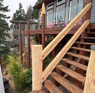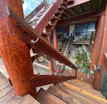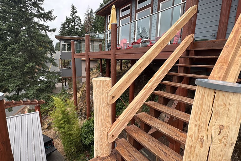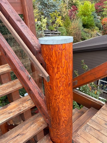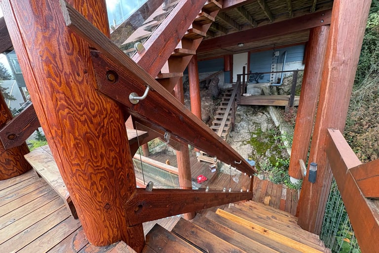 The posts were replaced with peeled fir logs and the fir railings were replaced with rot-resistant western red cedar. 2 coats of Transformations Oil Stain in Dark Red was applied to all replacement wood and logs. All joints were also chinked with Log Builder chinking to prevent water intrusion. The original fir railings also had to be replaced as they were rotting at the ends, and they were replaced with cedar beams, colour matched, and the original glass reinstalled. The client also wanted the old glass panels removed and new glass clamps and glass panels installed along with the replacement cedar railings.